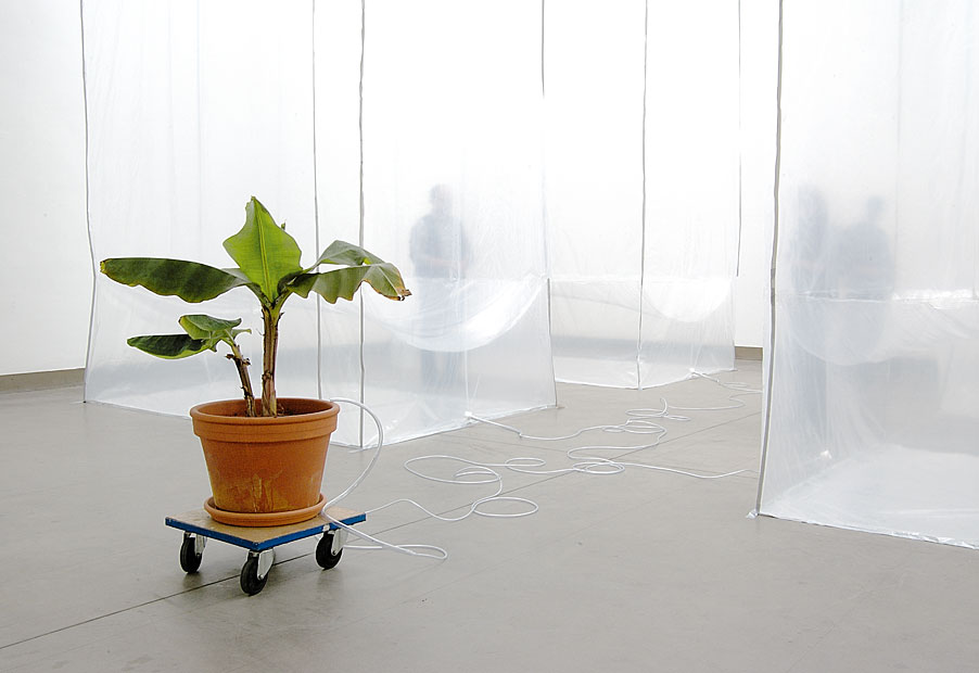 Aus jedem Quader tritt unter dem “Fußende” des Lagers ein transparenter Schlauch heraus, die Ausflüsse vereinigen sich zu einem System, welches im Topf einer seitlich abgestellten Bananenstaude mündet, welche als einzige Pflanze zum Inventar des Künstlerforums gehört. Die vertikalen Körper oszillieren im Ausdruck zwischen sakralen Monumenten für den Himmel als lebensspendenden Lichtraum und einer klinischen Pflegestation.