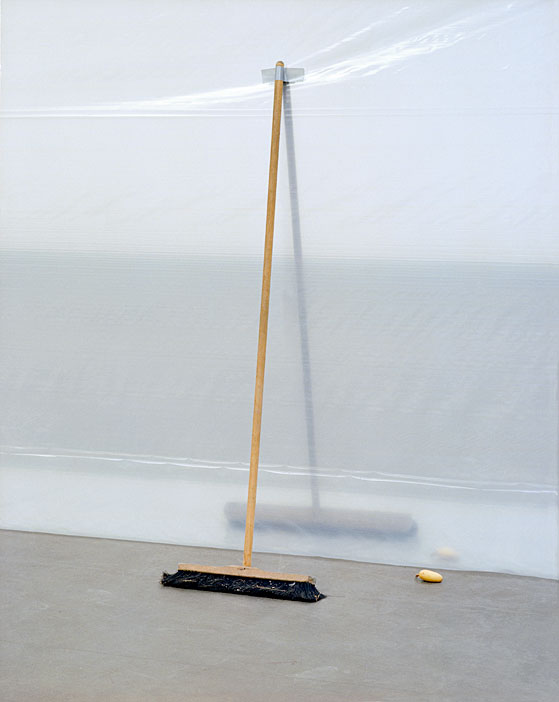 Der Raum ist in seiner Länge geteilt durch eine Fläche aus Kunststofffolie. Profane Objekte – Stühle, ein Zaun, eine Bierkiste, ein Besen, eine Topfpflanze stehen entlang der Folie und scheinen sich darin zu spiegeln. Das Arrangement, quasi ein Zitat eines Vorgartenidylls, wird jenseits der Folie durch entsprechende Pendants zu einem symmetrischen Bild ergänzt.
