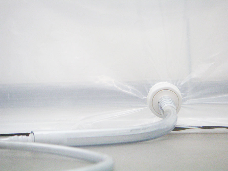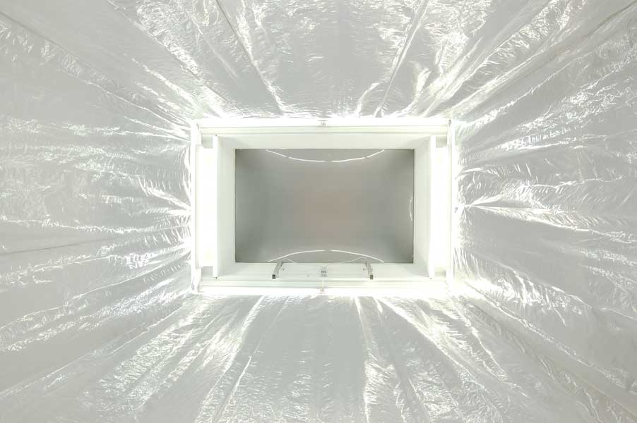 Vier monumentale Quader aus transparenter Kunststofffolie, die sich vertikal zwischen den rechteckigen Oberlichtern und deren Projektionen auf dem Boden spannen. Auf Kniehöhe ist in jedem Quader eine Membran aus feinerer Kunststofffolie so fixiert, dass der immaterielle Eindruck einer Bettstatt entsteht. Die im satten Parabelbogen hängende und bei jedem Luftzug vibrierende Haut steht im Kontrast zur stoischen Strenge der vertikalen Lichträume.