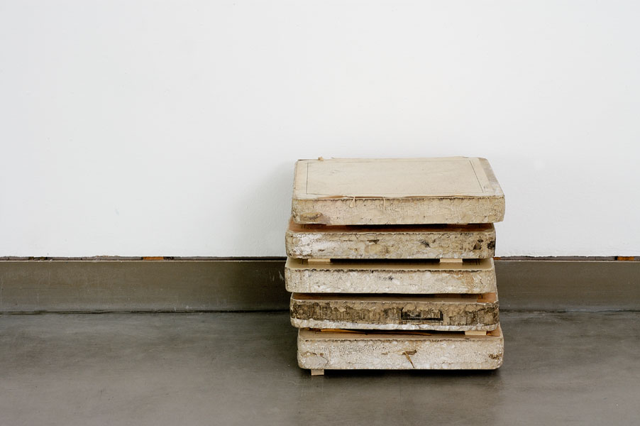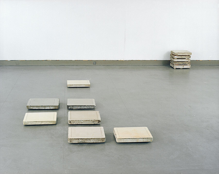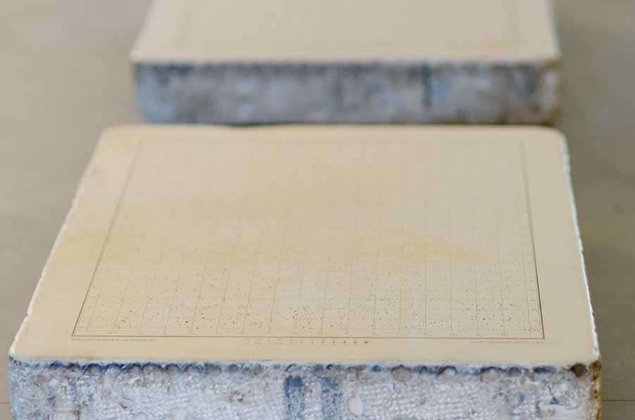 Die Objekte liegen da wie kompakte Gesetzestafeln, monumentale Komprimierung in Stein, materieller Kontrapunkt zur Unendlichkeit des Kosmos, von welchem die Steine nur ausschnitthafte Bildzitate zeigen.
