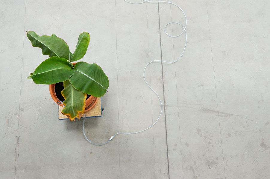 Aus jedem Quader tritt unter dem “Fußende” des Lagers ein transparenter Schlauch heraus, die Ausflüsse vereinigen sich zu einem System, welches im Topf einer seitlich abgestellten Bananenstaude mündet, welche als einzige Pflanze zum Inventar des Künstlerforums gehört. Die vertikalen Körper oszillieren im Ausdruck zwischen sakralen Monumenten für den Himmel als lebensspendenden Lichtraum und einer klinischen Pflegestation.