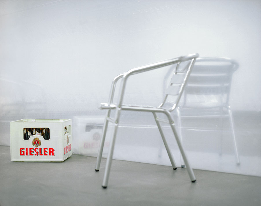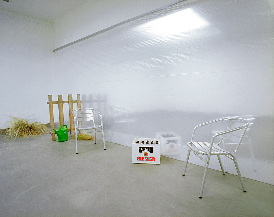 Der Raum ist in seiner Länge geteilt durch eine Fläche aus Kunststofffolie. Profane Objekte – Stühle, ein Zaun, eine Bierkiste, ein Besen, eine Topfpflanze stehen entlang der Folie und scheinen sich darin zu spiegeln. Das Arrangement, quasi ein Zitat eines Vorgartenidylls, wird jenseits der Folie durch entsprechende Pendants zu einem symmetrischen Bild ergänzt.